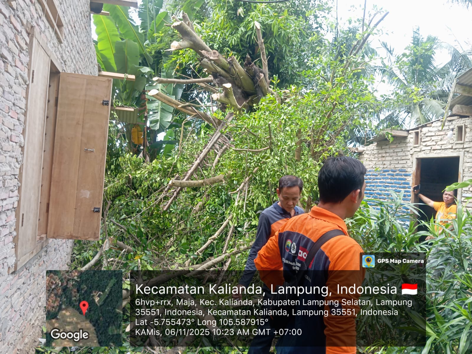 MitraBentala.or.id- Angin kencang yang melanda wilayah Desa Maja, Kecamatan Kalianda, Kabupaten Lampung Selatan, pada Kamis dini hari (6/11) sekitar pukul 03.00 WIB, menyebabkan sebuah pohon besar tumbang dan menimpa dua rumah warga di Dusun 1. Meskipun tidak ada korban jiwa dalam kejadian tersebut, dua rumah warga mengalami kerusakan ringan pada bagian atap akibat tertimpa batang pohon.