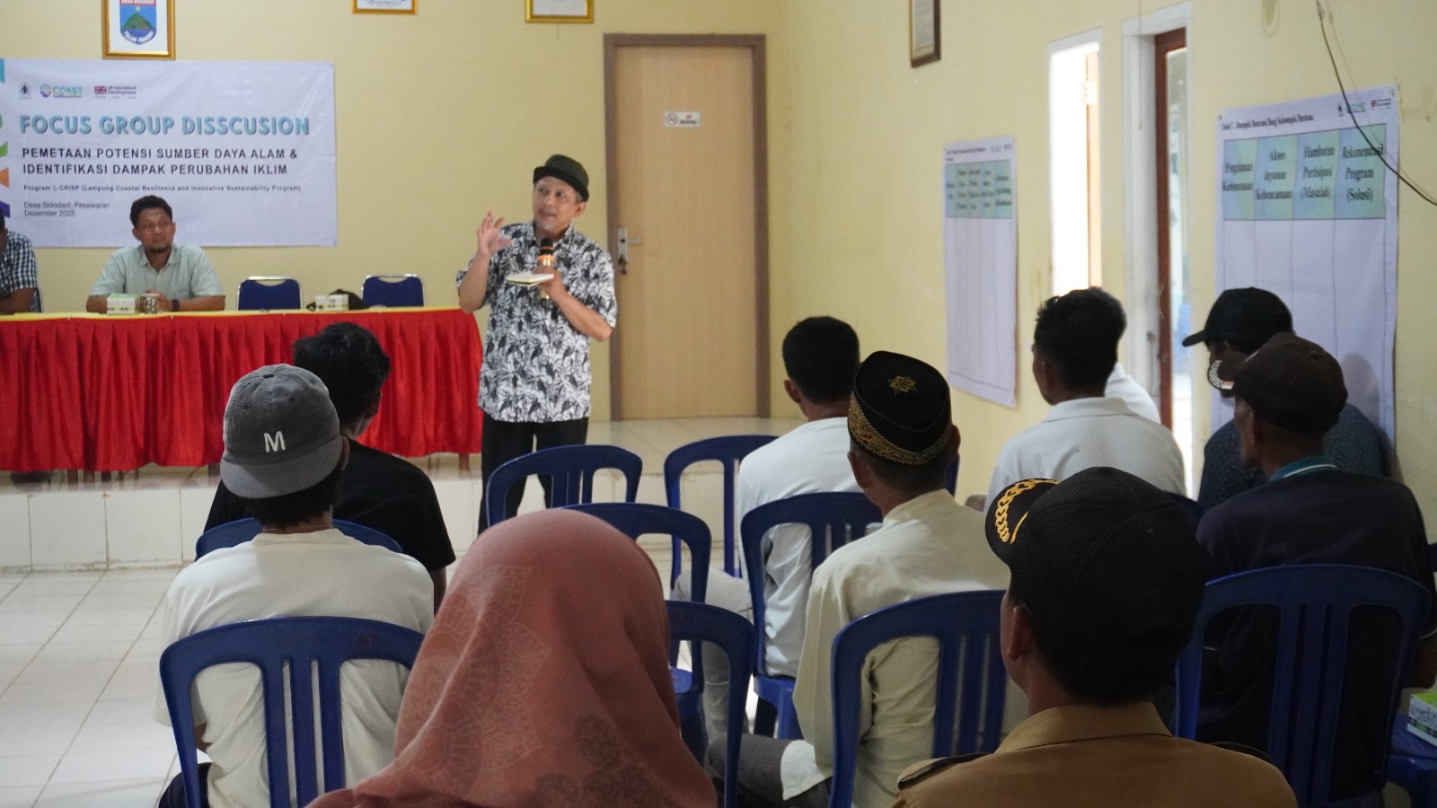 FGD ini melibatkan masyarakat dari Desa Gebang dan Desa Sidodadi (Kabupaten Pesawaran), Desa Bandar Agung dan Desa Sumbernadi (Kabupaten Lampung Selatan), serta Desa Margasari (Kabupaten Lampung Timur). Kehadiran perwakilan kelompok nelayan, pembudidaya perikanan, pelaku usaha pariwisata, perempuan pesisir, hingga kelompok rentan menjadi elemen penting dalam menggali perspektif yang beragam dan kontekstual terhadap kondisi wilayah pesisir.